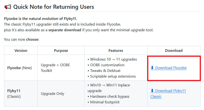Flyoobeのページを表示したら、ページを下にスクロールして「Download Flyoobe」をクリックします。