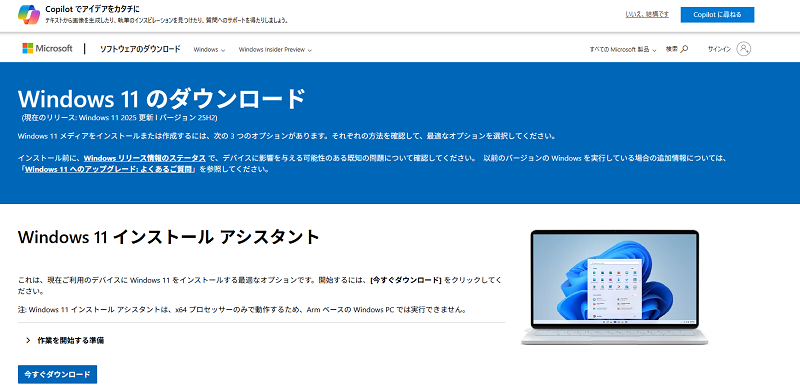 マイクロソフト「Windows11ダウンロード」ページへ移動します。