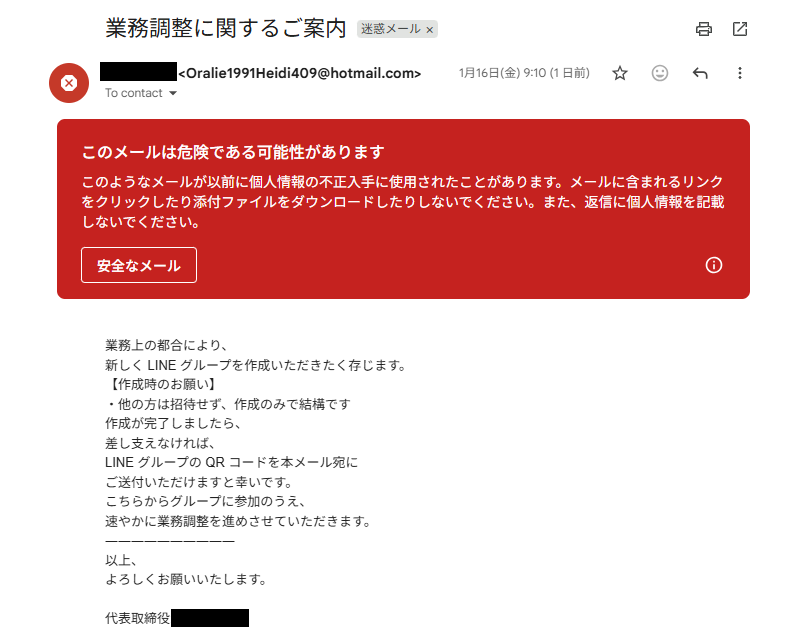 送信者名は、会社の代表者名になっているので信じてはいけません。見るべきところは、送信者のメールアドレスです。